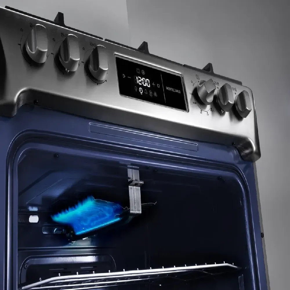 Modelo Montecarlo, Línea Zafiro. Tipo de Gas: GLP/Gas Natural. Dimensiones: Alto 95 x Ancho 76 x Prof.64. Tapa de vidrio templado. Tablero de acero inoxidable. Bisagras incorporadas. Parrillas de hierro fundido. 5 Quemadores UFO, sellados (1 Quemador Dualflame con apagado programable, 1 Quemador UltraFast, 1 Quemador Rápido, 2 Quemadores Semi Rápidos). Plancha Asadora. Control Touch (activación directa). Encendido directo desde las perillas en quemadores y horno. Reloj digital con apagado programable del sistema corta-gas. Perilla con termostato. Alarma. Bloqueo de panel de Control Touch. Doble vidrio templado. Válvula termostato con sistema corta-gas programable. Sistema turbo. Luz. Grill a gas. 2 Parrillas cromadas. (PRECIO CONTADO EFECTIVO) NO INCLUYE ENVIO